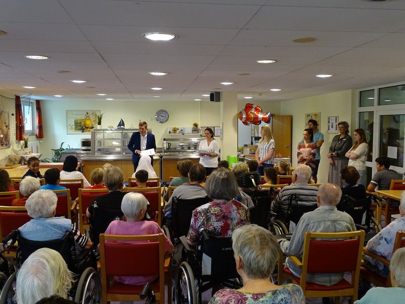 Zum Abschluss bekamen die Schüler und Schülerinnen vom Bürgermeister Nicolas Lahovnik und der Einrichtungsleitung Katharina Fürst eine Urkunde und eine kleine Aufmerksamkeit in der Cafeteria im St. Elisabeth überreicht. Anschließend gab es leckere Getränke und Kuchen und die Schüler/-innen haben sich offen und herzlich mit den Bewohner/-innen ausgetauscht. Wir hoffen auf eine Fortführung des Projekts nächstes Schuljahr.