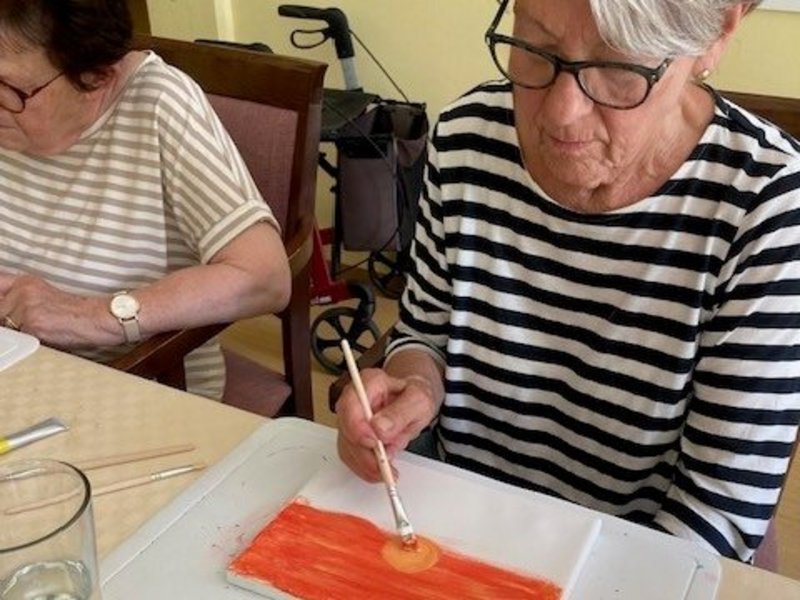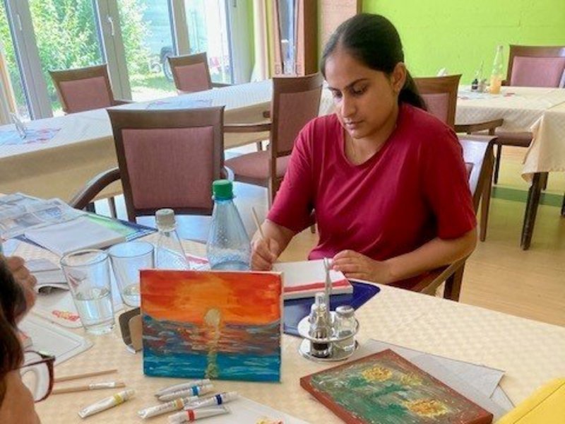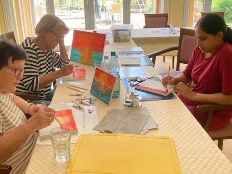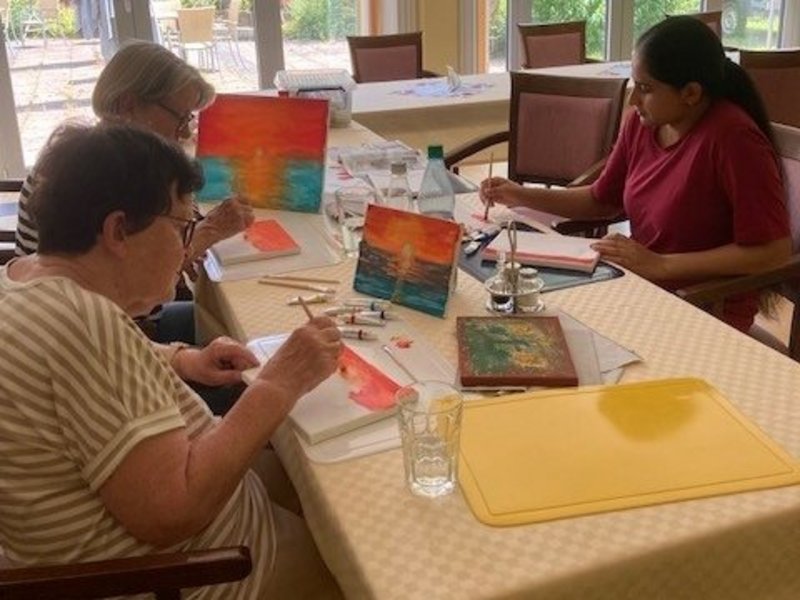 Auch dieses Mal war der Kreativ-Montag im Haus St. Hildegard ein voller Erfolg. Mit Acrylfarben und Leinwänden ausgestattet, haben wir gemeinsam gemalt – das vorgeschlagene Motiv: ein Sonnenuntergang, passend zur Sommerzeit. Die Idee dahinter: Urlaubsgefühle und schöne Erinnerungen an sonnige Tage am Meer zum Leben erwecken.