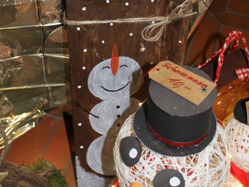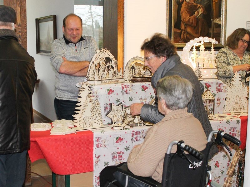 Zwölf Tische mit Christstollen, Gebasteltem und Kunsthandwerk waren aufgebaut, davon elf von externen Händlern. Der schönste und größte Stand war aber unser eigener. Möglicherweise hatte sich unser Hausmeister besonders viel Mühe mit dem Stand gegeben, weil seine Frau bei uns im Betreuungsteam arbeitet.